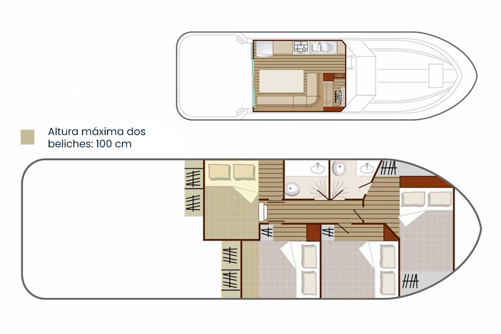 O Nicols 1160 da gama Sedan é um barco de rio ideal para as famílias. Dispõe de 3 cabinas duplas (2 das quais com uma altura livre de cerca de 100 cm, recomendada para as crianças) e 1 cabina com beliches + duas casas de banho para acolher confortavelmente uma tripulação de 8 pessoas (4 adultos + 4 crianças).