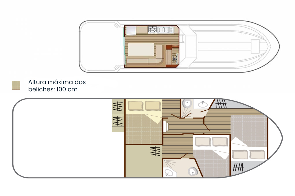 O equipamento a bordo varia consoante o modelo de barco. É, por isso, aconselhável consultar a página dedicada a cada barco para se informar sobre o equipamento específico disponível. Em geral, encontrará equipamentos para o seu conforto, como espaçosas salas de estar, uma cozinha totalmente equipada, camarotes com espaço de arrumação, um sistema de aquecimento e instalações sanitárias. Alguns modelos oferecem ainda equipamentos adicionais, como um terraço para banhos de sol ou ar condicionado. Certificamo-nos de que cada barco responde às suas necessidades para um cruzeiro agradável.
