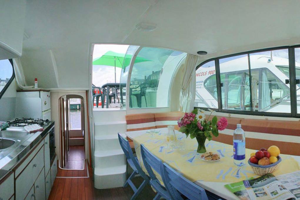 Sugestão: embora os barcos Nicols não tenham o rótulo "acesso para deficientes", alguns dos nossos modelos são mais adequados do que outros para pessoas com mobilidade reduzida. Por exemplo, as gamas Estivale e Fly são acessíveis pela popa, através de um portão largo. Atracando o barco na popa, é fácil deslocar-se do pontão para o terraço traseiro numa cadeira de rodas. O terraço da popa está ao mesmo nível que a sala de estar, que é acessível através de uma grande janela de sacada: também aqui é possível o acesso em cadeira de rodas. A sala de estar tem uma zona de cozinha, uma zona de pequeno-almoço e um banco que se transforma em cama de casal. Note-se, no entanto, que para chegar às casas de banho, aos chuveiros e às outras cabinas nocturnas, é necessário percorrer um corredor com cerca de 60 cm de largura, geralmente acessível através de 2 ou 3 degraus. O ideal é que a pessoa com mobilidade reduzida consiga pelo menos levantar-se, sozinha ou acompanhada, para dar os poucos passos necessários para chegar às casas de banho.