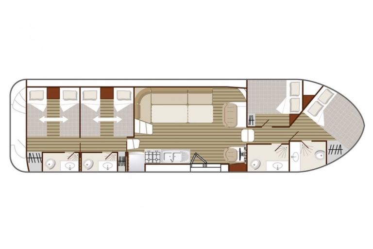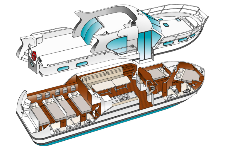 O Confort 1350 é um barco de rio ideal para 4 casais, com 4 camarotes espaçosos (altura livre de cerca de 2 metros) e 4 casas de banho privativas com sanitas eléctricas.