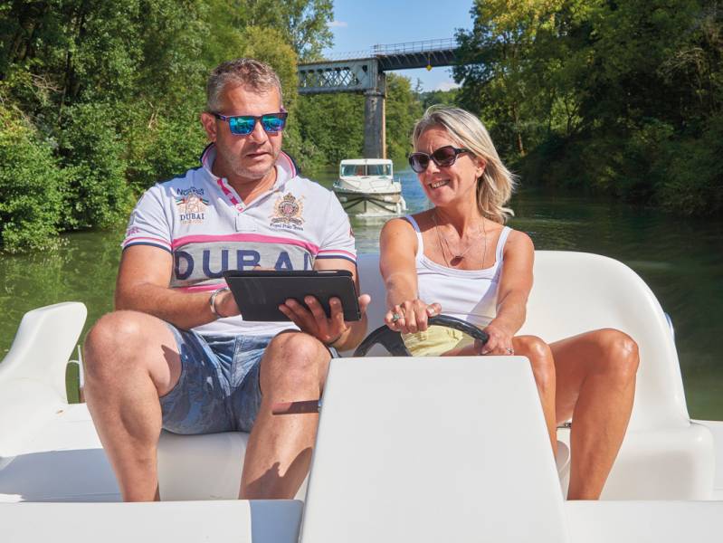 Pilotar um barco sem carta é simples e acessível. Todos os nossos barcos são fáceis de manusear, graças a uma ergonomia concebida para principiantes, e respeitam a legislação francesa: não têm mais de 15 metros de comprimento e a sua velocidade é limitada a 12 km/h. Os motores são estrangulados para garantir uma navegação segura, permitindo-lhe navegar a uma velocidade adaptada às vias navegáveis, muitas vezes limitadas a 6 ou 8 km/h.