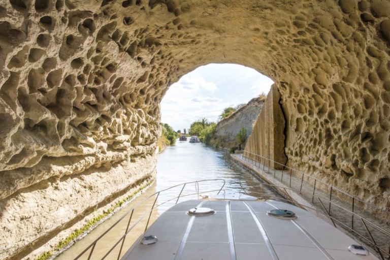 3. Malpas: atravessar o túnel-canal de barco e descobrir o sol "verde" O túnel-canal de Malpas (160 m) atravessa o Oppidum d'Ensérune, um dos maiores sítios arqueológicos de França, antiga cidade gaulesa e uma das mais importantes do Midi. Do cimo da colina de Ensérune, pode desfrutar de uma vista panorâmica de 360 graus entre as Cévennes e os Pirinéus, sobre a planície do Languedoc até à costa, e sobre o insólito "sol verde", a antiga lagoa de Montady, agora seca e com uma forma geométrica surpreendente.